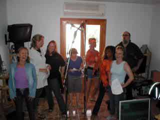 | Hier ein paar Impressionen von meiner vierten Formentera-Stippvisite Mai/Juni 2002. Diesmal habe ich an dem von Nick Rimsky-Korsakow (tatsächlich ein Verwandter des russischen Komponisten!) für Music-In organisierten Gesangsworkshop unter der Leitung von Inga Heckmann teilgenommen. Links oben seht ihr mich mit Inga, Melanie aus Duisburg, Mano aus Münster und Gerd in einer heissen Session am Grillabend. Rechts daneben die ganze Truppe vor unserer Hütte. Unten links die tollste Strandbar wo gibt, das Sun-Splash. Rechts daneben bin ich gerade mit meinen Mädelz dabei, unseren Gospelsong aufzunehmen. | ||